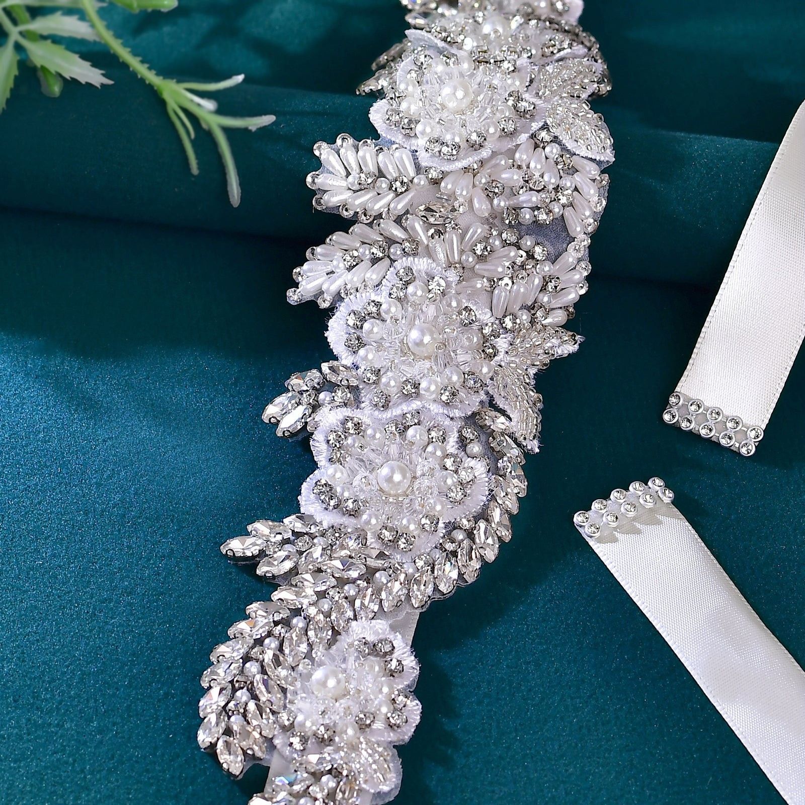 This couture sash features a luxurious blend of crystal rhinestones, pearl accents, bead-work, and embroidered floral appliqués, all arranged in an elegant vine-and-blossom pattern that catches the light beautifully from every angle.