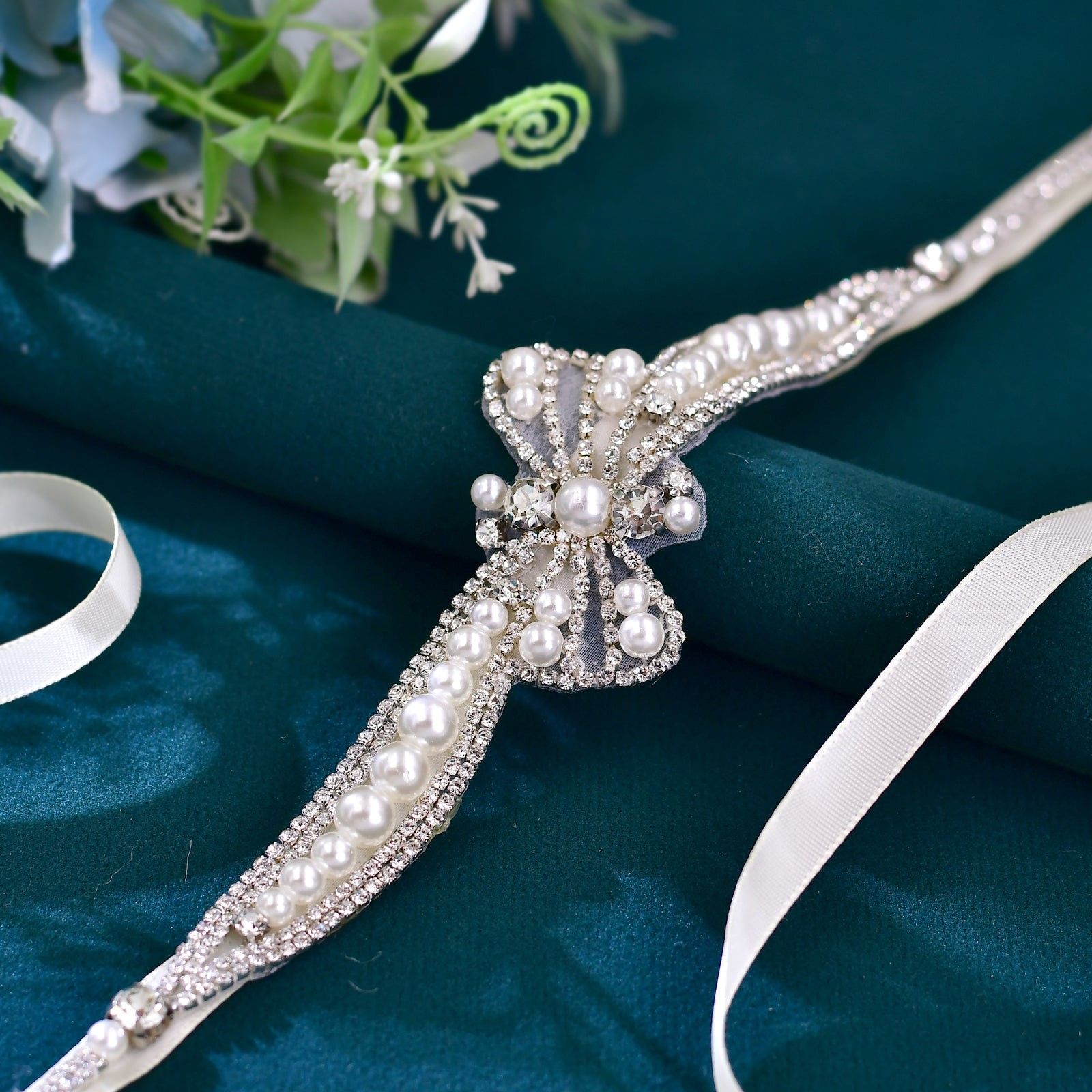 The flowing pearl-lined bands extend outward from the center, creating a balanced silhouette that enhances your natural shape without overpowering your dress. Finished with a soft ivory satin ribbon tie, it offers a comfortable, adjustable fit that feels as beautiful as it looks.